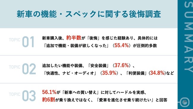 新車購入後、約半数が「後悔」を感じた経験あり。感じた後悔1位「追加で機能・装備が欲しくなった」が2位と約3倍差で最多