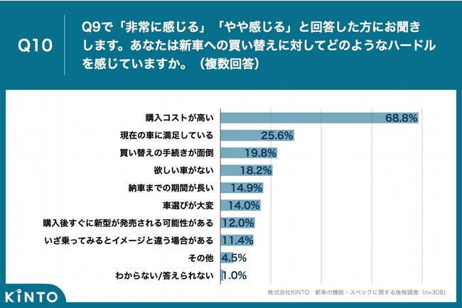 Q9で「非常に感じる」「やや感じる」と回答した方に、どのようなハードルを感じているか質問したところ、「購入コストが高い」が68.8%、「現在の車に満足している」が25.6%、「買い替えの手続きが面倒」が19.8%という回答となりました。