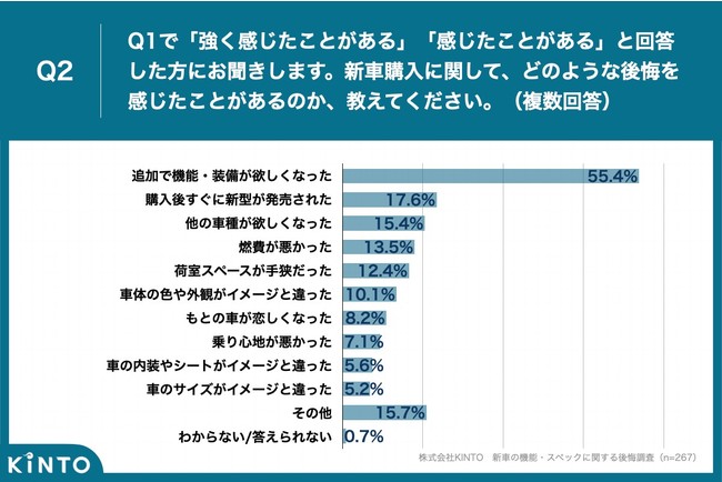 どのような後悔を感じたのかを尋ねると、「追加で機能・装備が欲しくなった(55.4%)」の回答が最も多く、2位の「購入後すぐに新型が発売された(17.6%)」と約3倍もの差がありました。購入後に、実装した機能や装備に物足りなさを感じる人が多いようです。