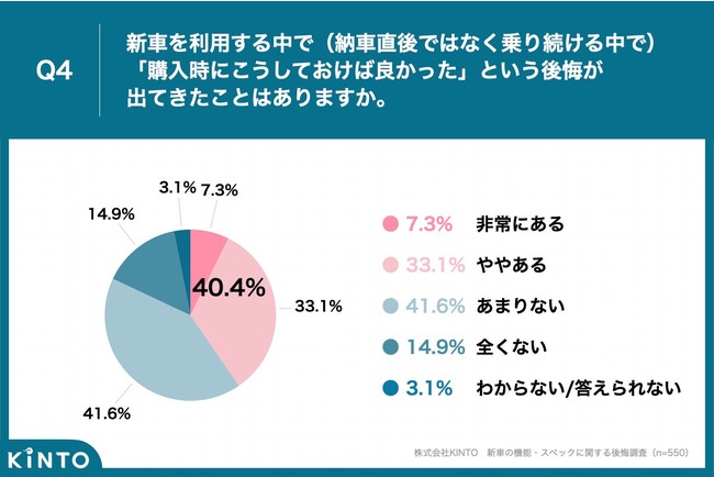 納車直後ではなく乗り続ける中で「購入時にこうしておけば良かった」という後悔が出てきたことがあるかと質問したところ、「非常にある」が7.3%、「ややある」が33.1%という回答となりました。