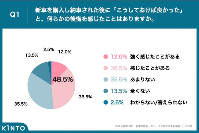 クルマのサブスクリプションサービスを展開する、株式会社KINTO(本社:愛知県名古屋市、代表取締役社長:小寺 信也)は、10年以内に新車を購入した方550人を対象に、新車の機能・スペックに関する後悔調査を実施いたしました。主な調査結果は、以下の通りです。