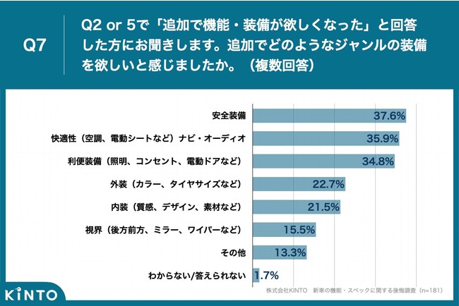 Q2 or 5で「追加で機能・装備が欲しくなった」と回答した方に、追加でどのようなジャンルの装備を欲しいと感じたか質問したところ、「安全装備」が37.6%、「快適性(空調、電動シートなど)、ナビ・オーディオ」が35.9%、「利便装備(照明、コンセント、電動ドアなど)」が34.8%という回答となりました。
