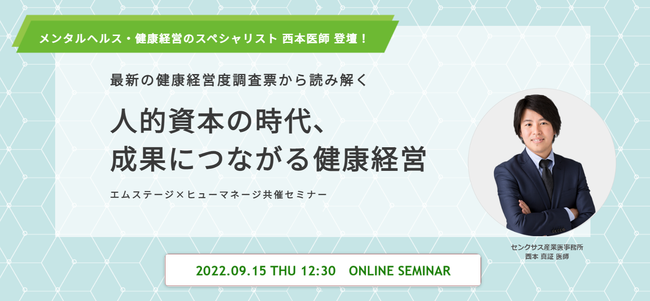 人材の“採用”から“定着”、その先の“活躍”までを支援する人材サービス事業を展開する株式会社ヒューマネージ(本社:東京都千代田区、代表取締役社長:齋藤 亮三)と、事業場向け産業保健サービス、医療人材総合サービスを提供する株式会社エムステージ(本社:東京都品川区、代表取締役:杉田雄二)は、9月15日(木)、人事総務・労務ご担当者様向け「健康経営」をテーマとした無料オンラインセミナーを共同で開催いたします。