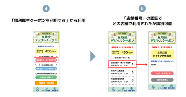 職員に配布したシリアルコードと、職員番号の2つで認証を行います。認証が完了すると、利用可能なポイントが配布されます。利用できるクーポン一覧から希望のクーポンを選択し、ポイントと引き換えに取得することができます。