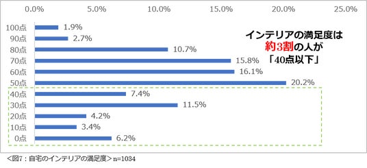 「自宅のインテリアにどの程度満足していますか?」という問いに点数で答えてもらったところ、約3割の人が「40点以下」と回答しました。(図7 )