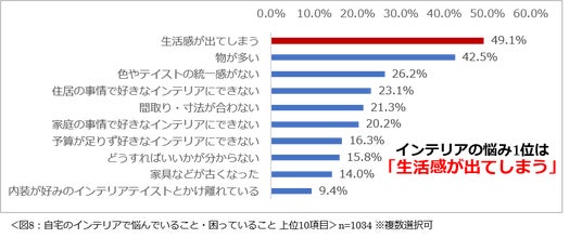 「自宅のインテリアで悩んでいることや困っていることは何ですか?」と尋ねたところ、「生活感が出てしまう」という回答が最も多く約半数にのぼり、「物が多い」(42.5%)、「色やテイストの統一感がない」(26.2%)という回答が続きました。(図8)
