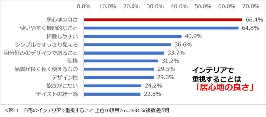 「ご自宅のインテリアで重視することは何ですか?」と尋ねたところ、「居心地の良さ」という回答が最も多く約7割となり、次いで「使いやすく機能的なこと」(64.8%)という回答が挙げられました。(図11)