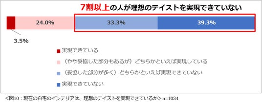 「現在の自宅のインテリアは、理想のテイストを実現できていますか?」と尋ねたところ、「実現できていない」39.3%と、「(妥協した部分が多く)どちらかといえば実現できていない」33.3%と回答した人を合わせると、7割以上の人が理想のテイストを実現できていないことが分かりました。(図10)