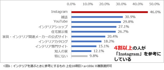 「インテリアを選ぶときに参考にするものはどれですか?」と尋ねたところ、「Instagram」が最も多く4割以上の人が回答。「雑誌」(30.9%)、「YouTube」(29.8%)という回答が続きました。(図5)