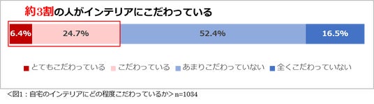 「自宅のインテリアにどの程度こだわっていますか?」と尋ねたところ、「とてもこだわっている」(6.4%)、「こだわっている」(24.7%)と回答した人を合わせると約3割の人が自宅のインテリアにこだわっていることが分かりました。(図1)