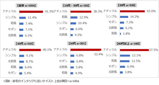 「自宅のインテリアに近いテイストはどれですか?」という問いに、以下の選択肢から選んでもらったところ、全年代で「ナチュラル」という回答が最も多く4割以上となりました。(図9)