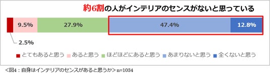 「自身はインテリアのセンスがあると思いますか?」と尋ねたところ、「あまりないと思う」47.4%、「全くないと思う」12.8%と回答した人を合わせると、インテリアセンスに自信がない人が約6割いることが分かりました。(図4)