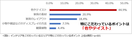 また、そのエリアで特にこだわっているポイントを尋ねたところ、「色やテイスト」という回答が最も多く、4割以上の人が回答しました。(図3)