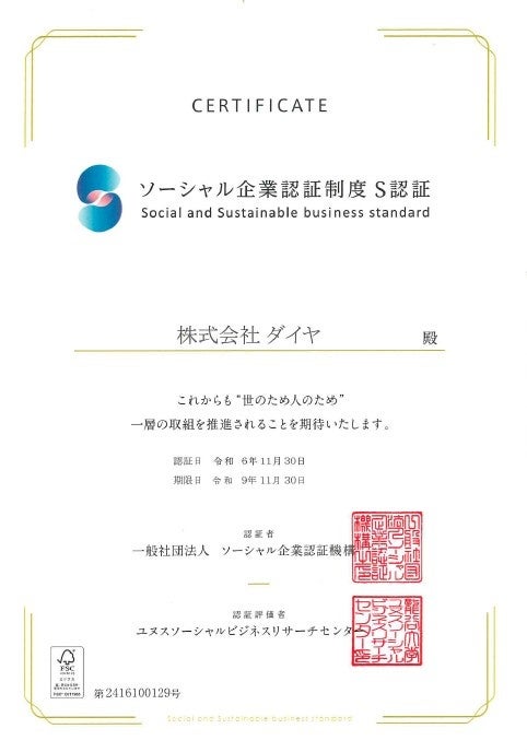 今年創業79周年の株式会社ダイヤ(本社:大阪市生野区新今里/代表取締役社長:多田俊介/以下ダイヤ)は、地域に根差したベーカリーとして地元の中学校や高校、専門学校、大学などへの職業体験や出前授業の次世代キャリア教育を高く評価され、社会課題の解決を目指す企業を評価する「ソーシャル企業認証制度 S認証」を取得しました。