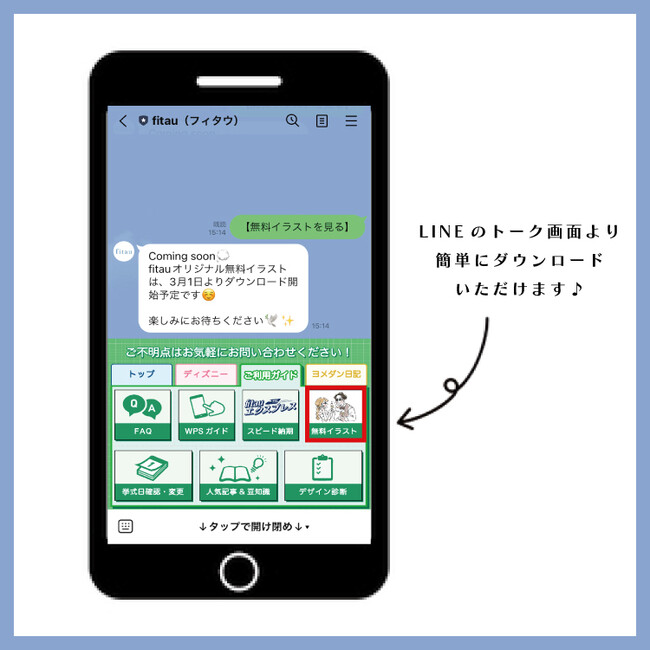 fitauのLINE公式は、「fitauオリジナルイラスト」サービスだけでなく、毎日のポイ活やクーポン配信、カウントダウンフォト作成などのサービスもご利用いただけるので、ぜひ登録してみてください。