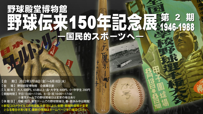 野球殿堂博物館では、2022年の野球伝来150年を記念し、150年を3期に分けて、150のキーワードで日本の野球史を振り返る展示を開催しています。第2期の今回は、1946年から1988年までの歴史を50のキーワードで振り返り、戦後の復興から、野球が国民的スポーツとなるまでの歩みを紹介します。