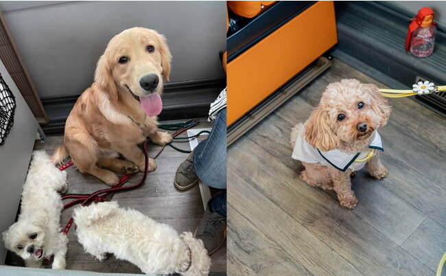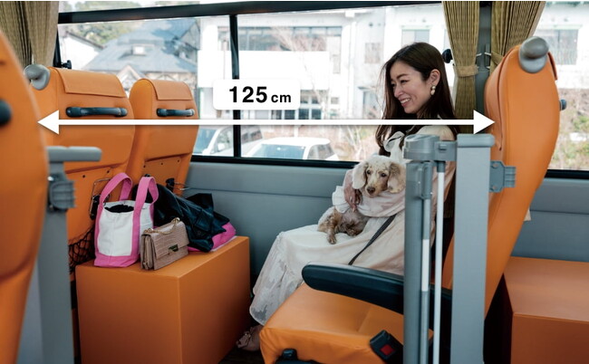 通常の座席よりも大幅に広げた約125cmのピッチ幅で、バギーを持ち込んでの乗車や大型犬を連れての乗車でも寛げる空間設計に。座席同士は互い違いの設置され、わんちゃん同士も気になりにくい設計になりました。