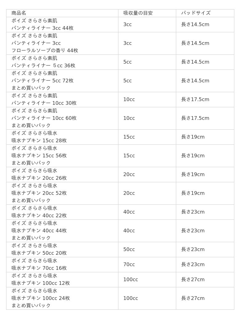 ■商品名/吸収量の目安/パッドサイズ