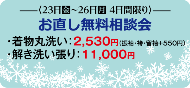 23日(金)~26日(月)4日間限りになりますが、お直し無料相談会が催されます。丸洗いから、お直しまで、専門のスタッフが対応いたします。