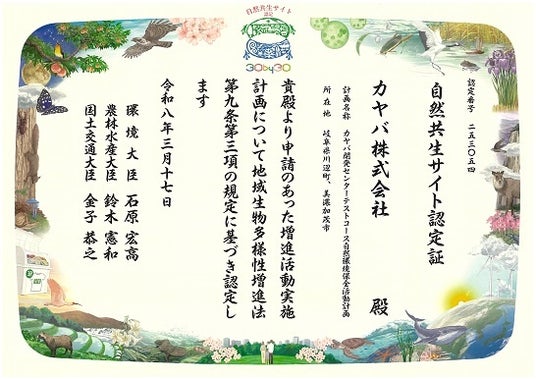 本認定は、「カヤバ開発センターテストコース自然環境保全活動計画」に基づき、地域の自然特性を活かした継続的な取り組みと今後の保全計画により、生物多様性の維持・向上に貢献している点が評価されたものです。