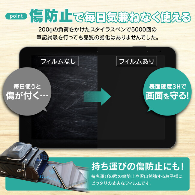 フィルムは表面硬度3Hで、画面を傷から守ります。200gの負荷をかけたスタイラスペンで5000回の筆記試験を行っても品質の劣化はありませんでした。