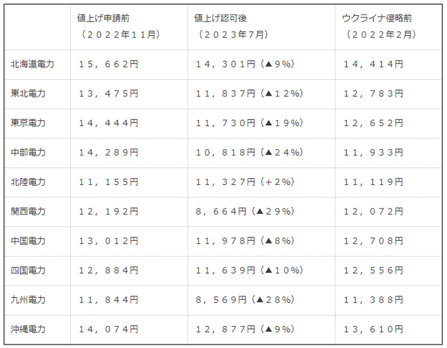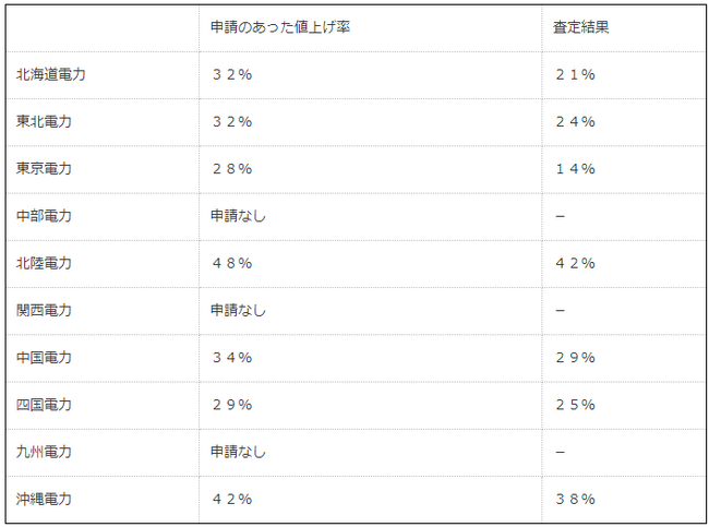 といった、前例にとらわれない極めて厳格な査定を行いました。その結果、査定後の標準的なご家庭における電気料金の値上げ率は、以下のとおりとなりました。