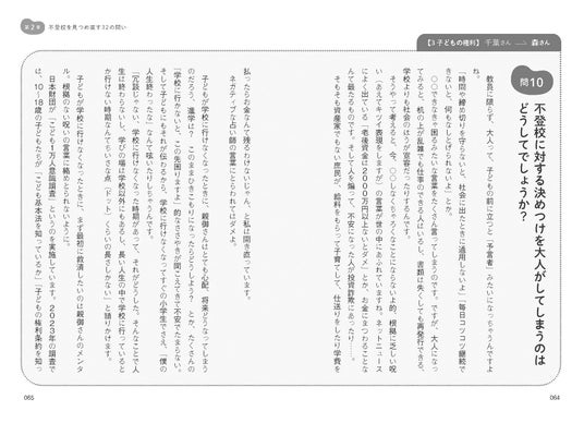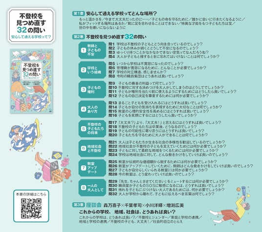 本書は、不登校というテーマに対し32の問いを立て、これからの学校、地域のあり方、大人のあり方を問うています。学校や社会が、柔軟に子どもたちの個性や特性を受け入れ、支えてあげられるようになるためにはどうしたら良いか……問いの一つひとつが、学校や社会をより良い未来へと変えていくためのヒントとなるよう、現状を見据えたテーマとなっています。