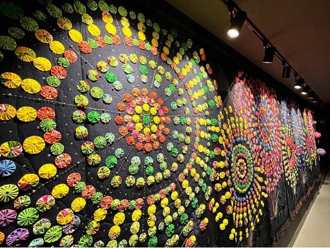 縦2m、横8mの壮大な作品はキルト作家の島田桃子氏が中心となり、2022年3月2日に長岡市とホノルル市が姉妹都市締結10周年を迎えたことを記念し制作されました。新型コロナウイルスの収束、そして世界平和や国際交流の再開を願い、長岡市民一人ひとりが「花火師」となるべく、一つ一つ手掛けた約1万個のヨーヨーキルトが壮大な長岡花火を作り上げました。