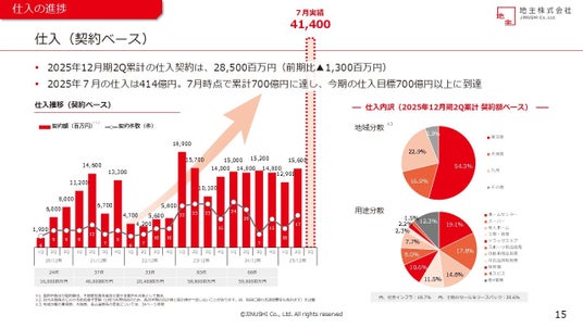 2025年12月期第2四半期の仕入(契約ベース)は28,500百万円(前期比▲1,300百万円)となりました。一方、足元の7月の仕入は41,400百万円となり、累計で70,000百万円に達し、今期の仕入目標である70,000百万円以上に到達しました。