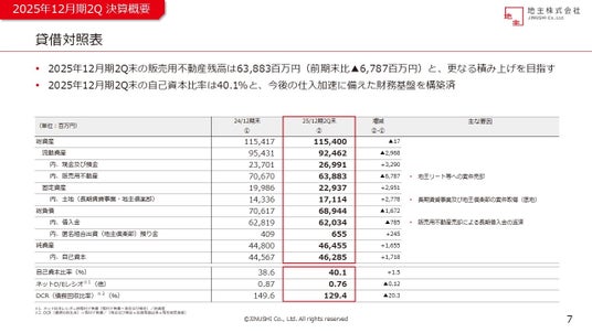 貸借対照表については、総資産は115,400百万円となり、前期末と同水準となりました。販売用不動産残高は63,883百万円と、前期末から6,787百万円減少しましたが、足元では仕入を加速しており、更なる積み上げを目指します。