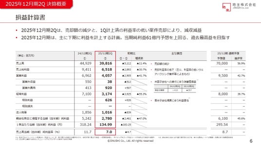 2025年12月期第2四半期は、売上高39,816百万円(前期比▲5,112百万円)、営業利益4,057百万円(同▲2,905百万円)、当期純利益2,780百万円(同▲2,461百万円)となりました。売却額の減少と、第1四半期に計上済の利益率の低い案件の売却により、前期比で減収減益となりましたが、期初想定通りに進捗しています。