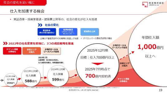当社は、2022年の社名変更を契機に、3つの成長戦略「テナント業種の多様化」「事業エリアの拡大」「土地のセール&リースバック提案」を推進し、仕入の拡大を目指してきました。この3つの成長戦略に加え、東証改革や、投資家からの要請、建築費の上昇等の社会の変化が、仕入を加速する追い風となっています。