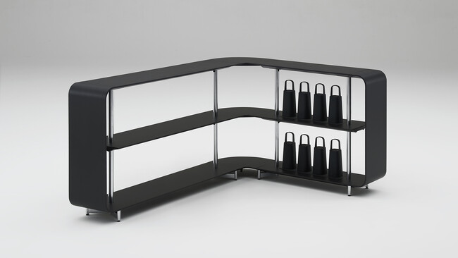 「コーネル」は、天板・側板・底板が一枚の紙のように繋がるシームレスなデザインのオープンシェルフです。ユニットを連結して一続きの天板面を構成することができます。コーナー棚板を使用することでL字、ジグザグなどのレイアウトも可能です。空間を柔らかく仕切るとともに、「コーネル」に雑誌やオブジェなどを飾ることでディスプレイとしてその場のカルチャーを伝えます。