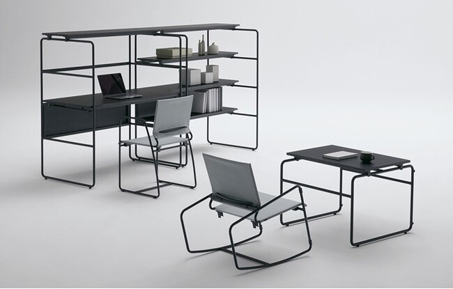 オフィスの最小単位であるデスク、チェア、シェルフをラインアップしています。工具を使わない簡単な組み換えで、デスクはローテーブルに、チェアはロッキングチェアに変えられます。シェルフは天板の数や高さを変更でき、デスク、ハイデスク、シェルフと用途に応じて切り替えることができます。シェルフは天板の高さを変更することでデスクとハイデスクに切り替えることができるデスクセットのほか、横に並べて棚板が隙間なくつながるシェルフセットを品ぞろえしています。家具の入れ替えを行うことなく個人作業からグループでのミーティングまでさまざまなワークスタイルに対応し、組織の規模に合わせてフレキシブルにオフィス空間をデザインできます。