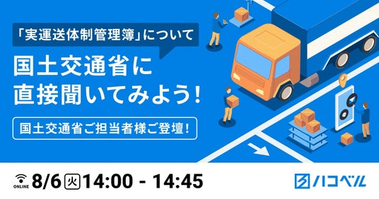 物流プラットフォーム「ハコベル」を展開するハコベル株式会社(本社:東京都中央区、代表取締役社長CEO:狭間 健志、以下:ハコベル)は、2024年8月6日(火)14:00~14:45において、国土交通省からゲストをお迎えのうえウェビナーを開催いたします。