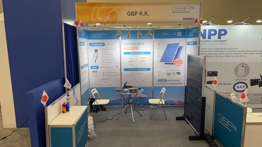 GBPは、他社が生産終了した太陽光パネルについて、同じ出力・寸法・厚み・取付穴位置と内径も指定してカスタマイズで生産しております。それに、出力が最大40%以上アップ、変換効率が最大10%アップも実現可能で、発電所のリパワリングとしても導入できますので、多くのお客様が興味を示して、名刺交換をさせていただきました。