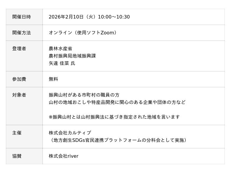 企業版ふるさと納税を活用した地域課題解決プラットフォーム「river(リバー)」を運営する株式会社カルティブ(本社:神奈川県横浜市、代表取締役:池田 清)は各省庁の出している補助金・交付金の活用方法を伝える「地方創生制度活用シリーズセミナー」として、2026年2月10日(火)に農林水産省担当者によるオンラインセミナー「山村の地域資源の活用~山村活性化支援交付金について~」についてを開催します。