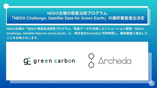 Green Carbon株式会社(代表取締役:大北潤、以下Green Carbon(読み;グリーンカーボン))はこの度、NEDO主催の「NEDO 懸賞金活用型プログラム/衛星データを活用したソリューション開発/NEDO Challenge, Satellite Data for Green Earth」に、衛星データを活用した森林資源モニタリング及び自然由来カーボンクレジット向けのモニタリングソリューションを開発する株式会社Archeda(本社:東京都千代田区、代表取締役:津村 洸匡、以下、Archeda(読み:アルケダ))と共同申請し、最終審査に進出したことをお知らせします。
