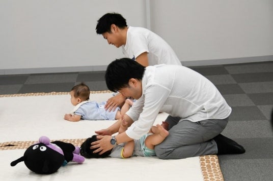 夫婦が共に子育てをする「共育て」推進事業として今回初めて開催する教室で、伊賀市内のパパと乳幼児10組の親子が参加しました。