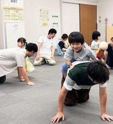 教室の内容は、最初にパパとお子さんが一緒に体をつかって遊ぶ「ふれあい遊び」をしました。パパならではのダイナミックな動きに、お子さんの笑顔がはじけていました!