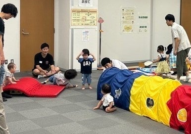 参加したお子さんの月齢は、生後5か月から4歳と幅広かったため、乳児・幼児に合わせた内容を取り入れました。乳児はカーペットの上での遊びが大半だったこともあり、はじめましてのパパ同士が交流する場面もみられました。