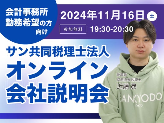 サン共同税理士法人(本社:東京都港区、代表社員: 朝倉 歩)は、2024年11月16日(土)19時30分よりオンライン会社説明会を開催いたします。