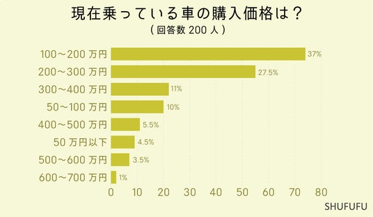 現在乗っている車の購入価格は?の問いに対して最も多かったのが「100~200万円(37%)」でした。 次いで「200~300万円(27.5%)」「300~400万円(11%)」という結果でした。200万円以下で購入された方が半数以上となりました。