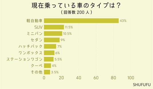 現在乗っている車のタイプを尋ねたところ、1位は「軽自動車(43%)」、2位「SUV(11.5%)」となりました。車体価格や維持費が安く小回りも効く軽自動車は多くの世代の人から指示されているようです。