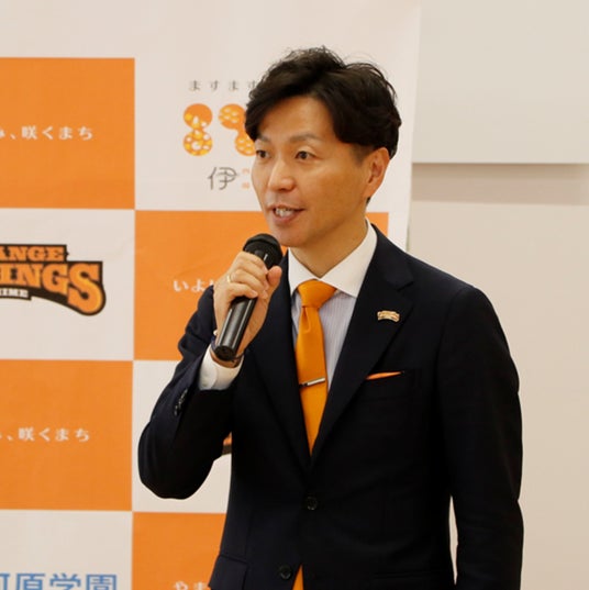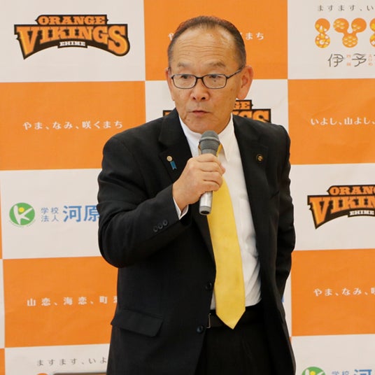愛媛県伊予市この度の協定締結は、過疎化著しい中山地域に新たな光を当てるものである。廃校となった中山高校が河原学園の未来高校中山キャンパスとして活用され、さらにオレンジバイキングスの練習拠点となることで、地域の活性化に繋がることを期待する。若い世代や選手たちが中山地域を歩くことで、人が交流し、まちが元気になる。この素晴らしい取組を共に応援する。協定締結を「ファーストステージ」として、今後ますます盛り上がっていくことを願う。
