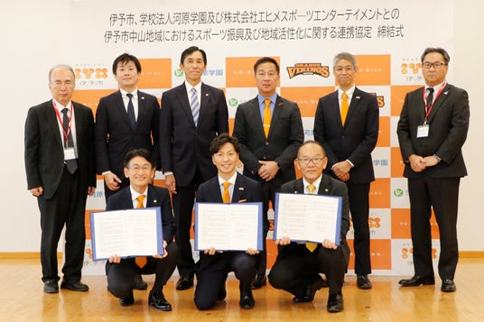 愛媛県伊予市は、学校法人河原学園及び株式会社エヒメスポーツエンターテイメントと『伊予市中山地域におけるスポーツ振興及び地域活性化に関する連携協定』を締結し、三者の連携により地域活性化を推進します。