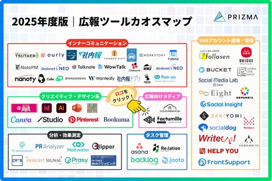 ファクトデータでマーケティングを加速させる「PRIZMA|調査リリース」(https://www.prizma-link.com/press)を提供する株式会社PRIZMA(本社:東京都渋谷区 代表取締役:杉本 昂輝 )は、広報・SNS運用・社内コミュニケーション領域を支援する各種ツールをまとめた「広報ツール カオスマップ 2025年版」を公開いたしました。
