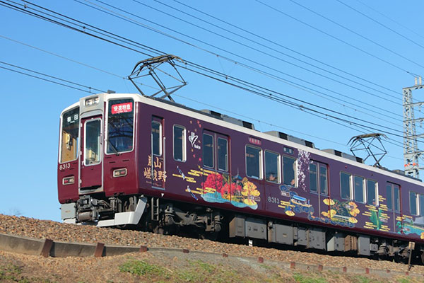 愛称をラッピングし、ヘッドマークを付けた列車 「古都」 は、3月28日(土)~5月6日(水・休)の土・日・祝日に、梅田駅~嵐山駅間の臨時直通「快速特急」(6両編成)として運行します。