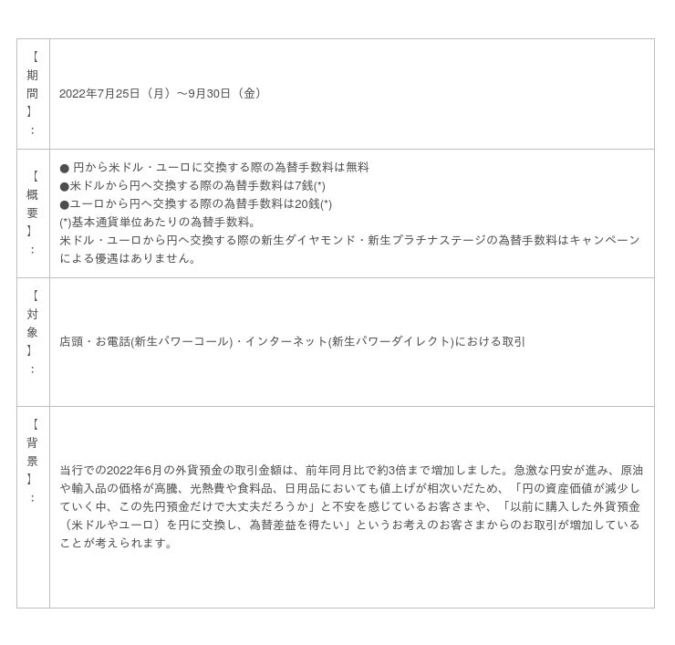 当行は「顧客中心主義の徹底」という基本コンセプトの下、近時の為替相場の動向をうけて外貨預金取引が大幅に増加している状況を踏まえ、お客さまのニーズにお応えすることを目的に、2022年7月25日(月)より以下の通り為替手数料引き下げキャンペーンを実施いたします。