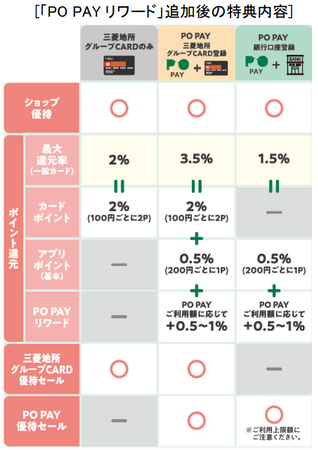 これにより「PO PAY」に三菱地所グループCARD(Visa)を登録した場合、同カードの三菱地所グループポイント(2%)と「PO PAYリワード」によるアプリポイント(最大1.5%)の合計最大3.5%のポイント還元を受けることができるものです。